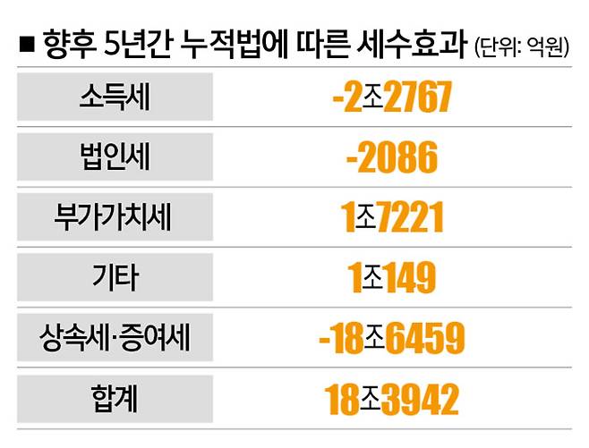 이에 따라 순액법보단 누적법(기준연도 대비 증감)으로 세수효과를 따져봐야 한다는 목소리가 나온다. 가령, 누적법은 세법을 개정한 2024년을 기준연도로 두고 2025년부터 2029년까지 매년 얼마의 세수효과가 나타나는지를 따지는 방식이다.