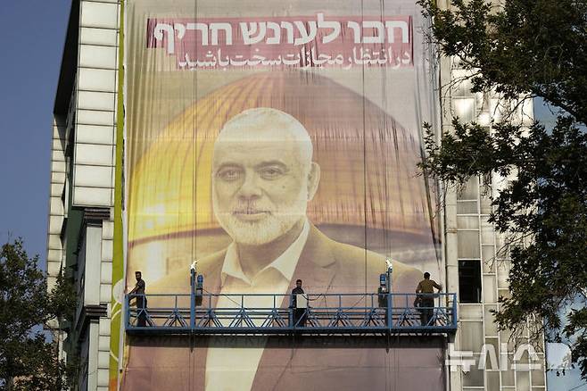 [테헤란=AP/뉴시스] 지난달 31일(현지시각) 이란 테헤란의 팔레스타인 광장에서 인부들이 하마스 정치국 최고 지도자 이스마일 하니예의 사진이 담긴 초대형 현수막을 벽에 설치하고 있다. 현수막에는 "가혹한 보복이 따를 것"이라고 쓰여 있다. 하니예는 지난달 30일 마수드 페제시키안 이란 신임 대통령의 취임식 참석차 테헤란을 방문했다가 이스라엘의 공습으로 숨진 것으로 알려졌다. 2024.08.01.