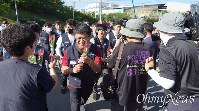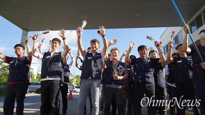 이들의 출근을 축하하기 위해 달려온 김태영 민주노총 경북본부장은 "회사 안에서 비정규직들이 조금만 잘못해도 '징벌 조끼'를 입혀서 마치 벌을 세우듯이 근무를 시켰다는 이야기가 지금도 생각난다"며 "오늘 출근하는 마음이 민주노조를 다시 세워야 되는 마음이었으면 좋겠다"고 말했다.