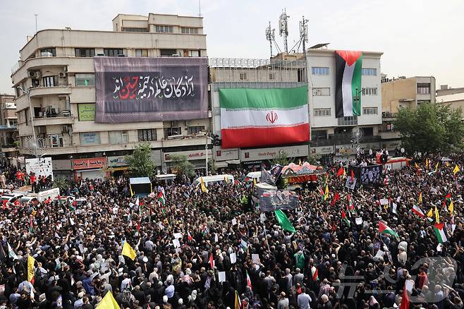 (테헤란 로이터=뉴스1) 김종훈 기자 = 이란 시민들이 1일(현지시간) 이란 테헤란에서 암살당한 하마스 지도자 이스마일 하니예 장례 행렬에 참여하고 있다. 2024.08.01.