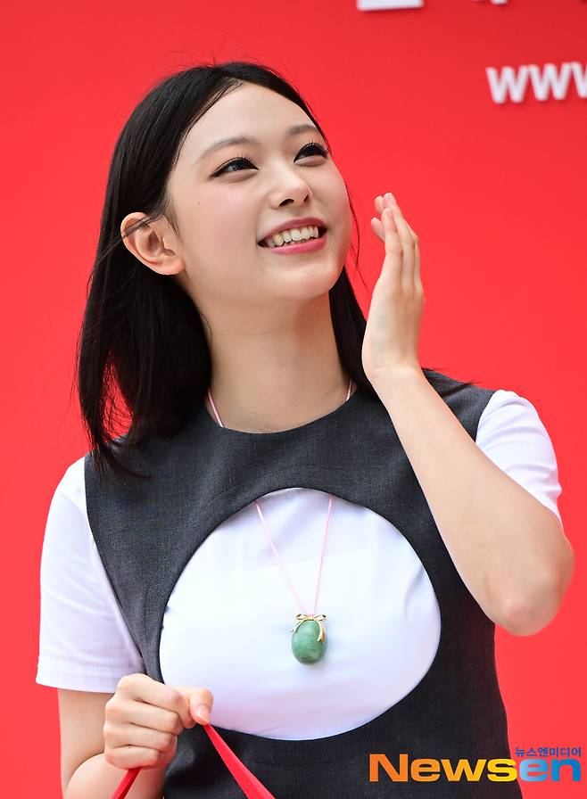 뉴진스(민지, 하니, 다니엘, 해린, 혜인)가 8월1일 오우 서울 중구 현대백화점면세점 동대문점 야외광장에서 열린 한 프로모션 포토월 행사에 참석했다.