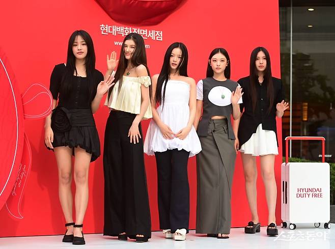 그룹 뉴진스가 1일 서울 중구 현대백화점면세점 동재문점에서 열린 ‘에브리데이 현데이’ 프로모션 특별 이벤트 기념 포토월에서 포즈를 취하고 있다. 주현희 기자 teth1147@donga.com