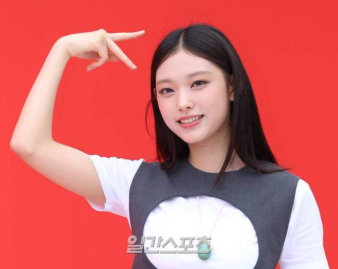 그룹 뉴진스 해린이 1일 오후 서울 중구 을지로6가에서 열린 한 백화점 프로모션 행사에 참석해 포즈를 취하고 있다.