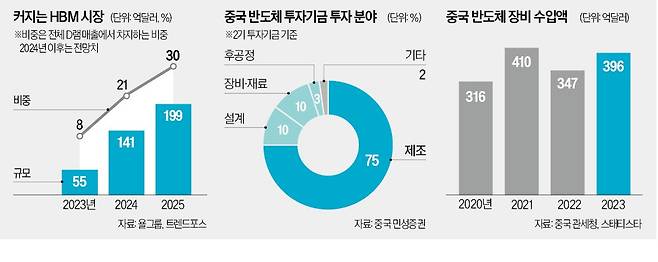 국내 기업들은 현재 중국에 수출하는 HBM 물량이 많지 않은 만큼 당장 피해 규모는 크지 않을 것이라고 설명한다. 하지만 중국 HBM 시장이 향후 수십조원 규모로 커질 수 있다는 점, 미국의 규제가 중국 반도체 기업들의 ‘HBM 자립’을 부추길 수 있다는 점 등에서 한국 기업에 대형 악재가 될 것이란 분석도 나온다.