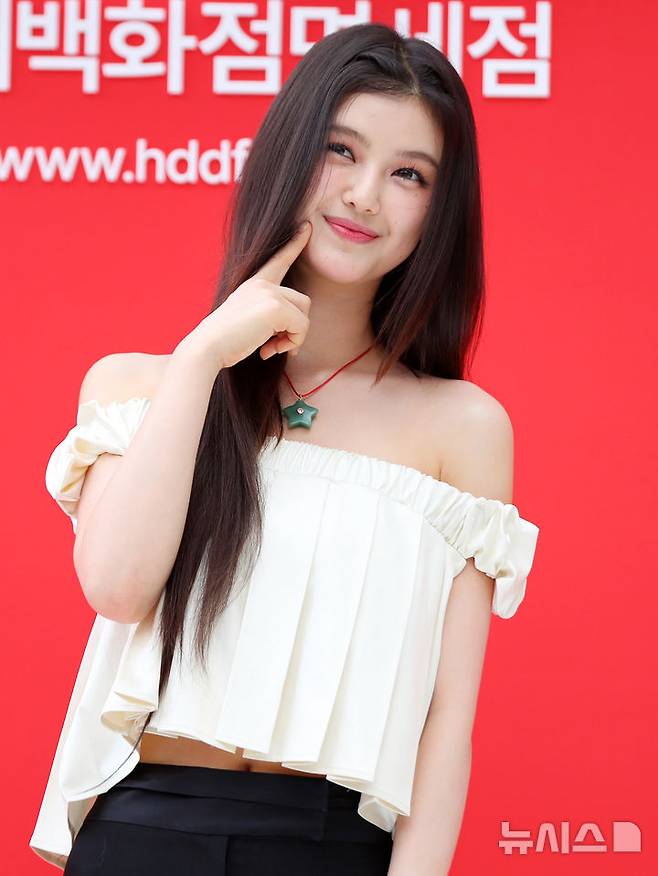 [서울=뉴시스] 김혜진 기자 = 그룹 뉴진스 다니엘이 1일 오후 서울 중구 현대백화점면세점 동대문점에서 열린 '에브리데이 현데이' 프로모션 기념 포토행사에서 포즈를 취하고 있다. 2024.08.01. jini@newsis.com