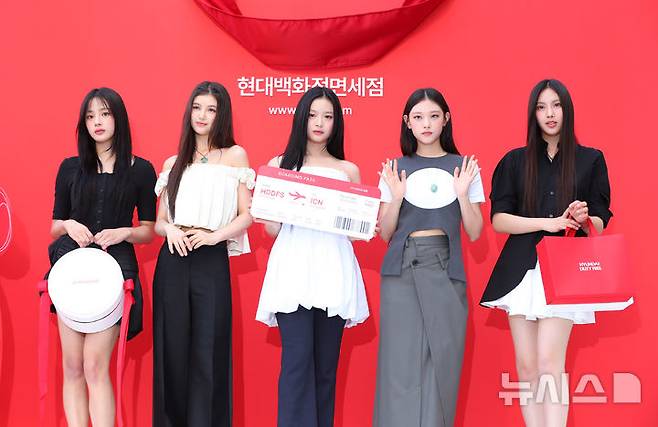 [서울=뉴시스] 김혜진 기자 = 그룹 뉴진스(왼쪽부터 민지, 다니엘, 하니, 해린, 혜인)가 1일 오후 서울 중구 현대백화점면세점 동대문점에서 열린 '에브리데이 현데이' 프로모션 기념 포토행사에서 포즈를 취하고 있다. 2024.08.01. jini@newsis.com
