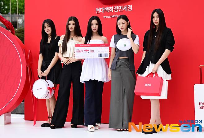 뉴진스(민지, 하니, 다니엘, 해린, 혜인)가 8월1일 오우 서울 중구 현대백화점면세점 동대문점 야외광장에서 열린 한 프로모션 포토월 행사에 참석했다.
