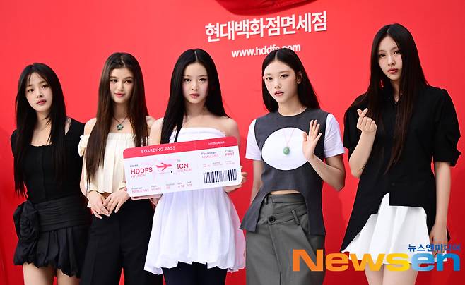 뉴진스(민지, 하니, 다니엘, 해린, 혜인)가 8월1일 오우 서울 중구 현대백화점면세점 동대문점 야외광장에서 열린 한 프로모션 포토월 행사에 참석했다.