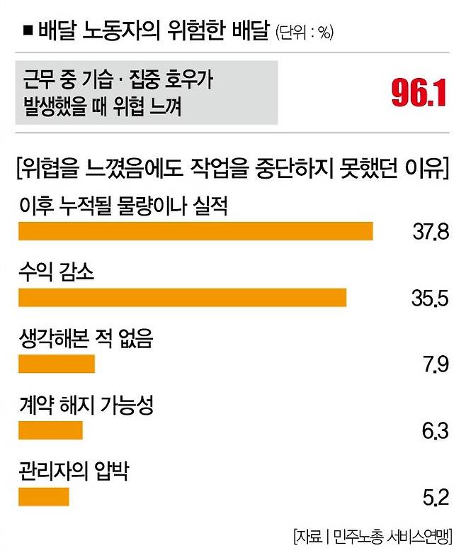 96.1 %(1152명)에 달하는 노동자는 '근무 중 기습ㆍ집중 호우가 발생했을 때 위협을 느낀다'고 말했습니다. 위협을 느꼈는데도 작업을 중단하지 못했던 이유로는 '이후 누적될 물량이나 실적'(37.8%)이라는 응답이 가장 많았고, '수익 감소'(35.5%)가 뒤를 이었습니다.