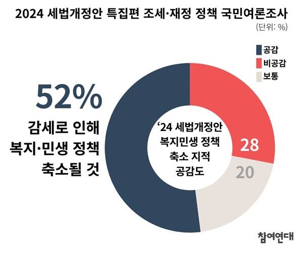 여론조사 결과, 2024년 세법개정안이 시행될 경우 세수 감소로 인해 복지와 민생 정책이 축소될 것이라는 지적에 공감한다는 응답이 52%로 나타났습니다.
