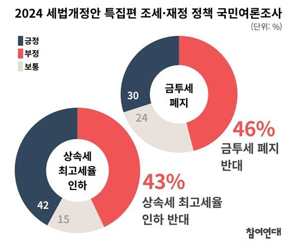 2024년 세법개정안 가운데 금투세 폐지와 상속세 최고세율 인하에 대해 각각 46%, 43%가 반대한다고 응답하였습니다.