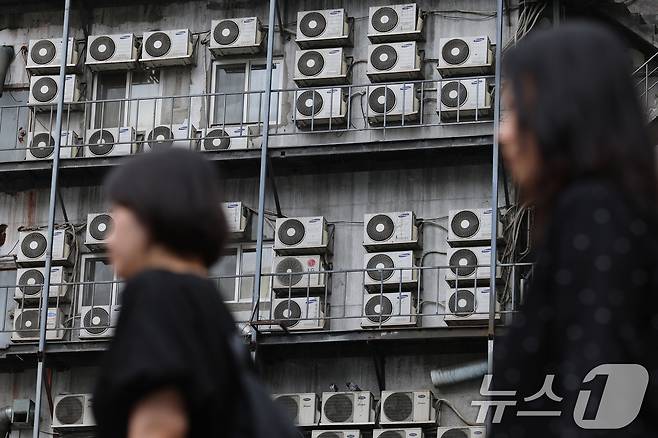 (서울=뉴스1) 신웅수 기자 = 전국적인 폭염이 이어지고 있는 2일 서울의 한 건물 외벽에 설치된 에어컨 실외기가 빠르게 돌아가고 있다.