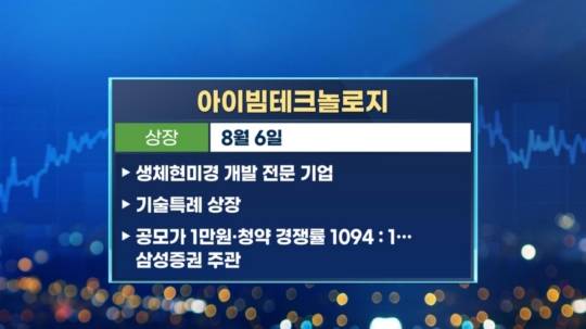 <캐스터> 다음주 화요일인 8월 6일 의료기기 기업인 아이빔테크놀로지가 상장합니다. 동물 대상으로 신약실험을 할 때 쓰이는 생체현미경을 개발하는 기업인데요. 수요예측과 청약에서 연달아 흥행했다는 평가가 나온 가운데, 1094:1의 청약경쟁률을 기록했고요.