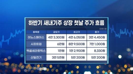 하반기 새내기주들 첫날 흐름 되짚어보면요. 관심 쏠렸던 종목 마저도, 공모가에서 100% 상승률을 보이는 ‘따블’조차 한 건도 나오지 않았고요. 지난달 신규 상장한 이노스페이스와 엑셀세라퓨틱스는 상장 당일 공모가에 미치지 못하는 가격으로 마감했습니다.