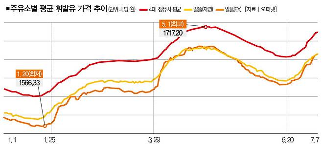 "6월 30일 대비 7월 7일 전국 주유소 판매가격은 최근 국제유가 상승분과 유류세 환원분을 고려할 때 휘발유는 L당 30.3원, 경유는 31.4원 상승했다. 반면 알뜰주유소에선 휘발유 L당 24.6원, 경유 L당 26.3원 오르는 데 그쳤다."