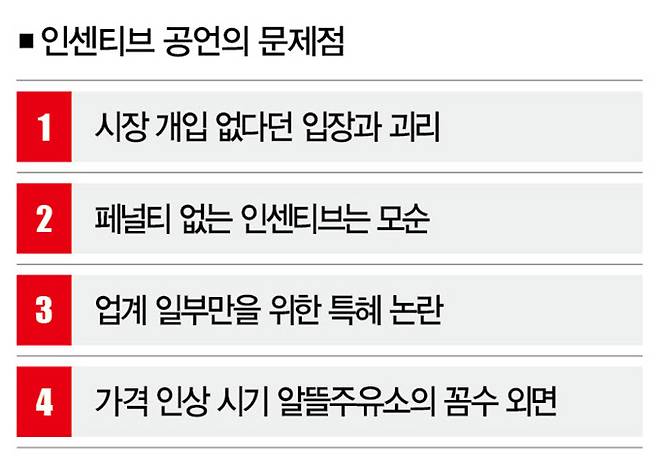 ■ 문제➋ 인센티브의 형평성 = 알뜰주유소만을 대상으로 한 '인센티브'나 '공급가 혜택'은 형평성 측면에서도 공격을 받는다. 이번 정부의 '인센티브' 발표 후, 주유소 업계가 크게 반발한 것도 이 때문이다.