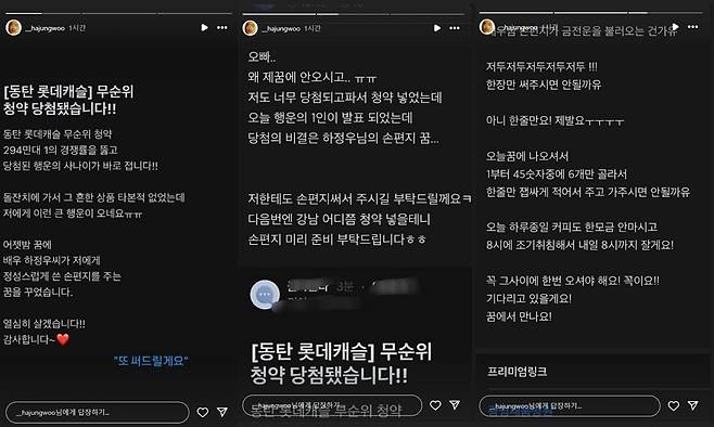 게시자는 '294만 대 1의 경쟁률을 뚫고 당첨된 행운의 사나이가 바로 접니다. 돌잔치에 가서 그 흔한 상품 타본 적 없었는데, 저에게 이런 큰 행운이 오네요. 어젯밤 꿈에 배우 하정우 씨가 저에게 정성스럽게 쓴 손 편지를 주는 꿈을 꾸었습니다. 열심히 살겠습니다. 감사합니다'라고 썼다.