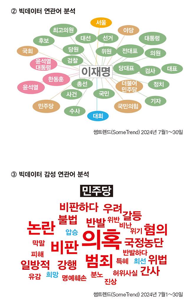 그렇다면 빅데이터 반응은 어떻게 나올까. 빅데이터 심층 분석 도구인 썸트렌드(SomeTrend)로 7월1~30일 이 전 대표에 대한 빅데이터 연관어를 도출해 보았다. 이 전 대표에 대한 빅데이터 연관어는 '윤석열 대통령' '한동훈' '더불어민주당' '국민의힘' '국회' '야당' '서울' '후보' '최고위원' '선거' '대선' '당원' '검찰' '검사' '당대표' '전 대표' '위원' '의원' '총선' '대회' '사건' '수사' '국민' '정치' '대통령' '기자' 등으로 나왔다(그림②). 정치적 대립각에 서있는 윤 대통령과 한 대표가 등장하고 나머지는 이재명 전 대표를 호칭하는 연관어들이 집중 부각된 빅데이터 연관어다. 지난 총선 직전의 상황처럼 이낙연 전 대표나 원칙과 상식에 속했던 당시 의원들 같은 반발 현상은 전혀 나타나지 않는다. 더 심해진 이재명 일극체제가 중도층이나 수도권 그리고 2030세대에 부정적 영향을 주었고, 그것이 정당 지지율 추락의 이유로 풀이된다.
