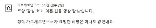 그럼에도 가로세로연구소 측은 "쯔양 '감성 호소' 여론 선동 영상 잘 봤다"며 명의도용 낙태수술 기록에 대한 증거 요구를 하고, A씨를 만나기전 유흥주점 근무 여부에 대한 해명이 빈약하다고 짚었다. 그러면서 "쯔양의 거짓말은 별개의 문제"라며 3가지 해명 요구에만 답하라고도 요청했다.