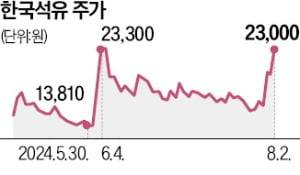 2일 한국거래소에 따르면 이날 한국석유는 전일 대비 13.86% 오른 2만3000원에 장을 마감했다. 장중엔 2만3850만원까지 치솟기도 했다. 지난달 31일 주가가 24.54% 오른 이후 이틀 만에 다시 큰 폭으로 상승했다.