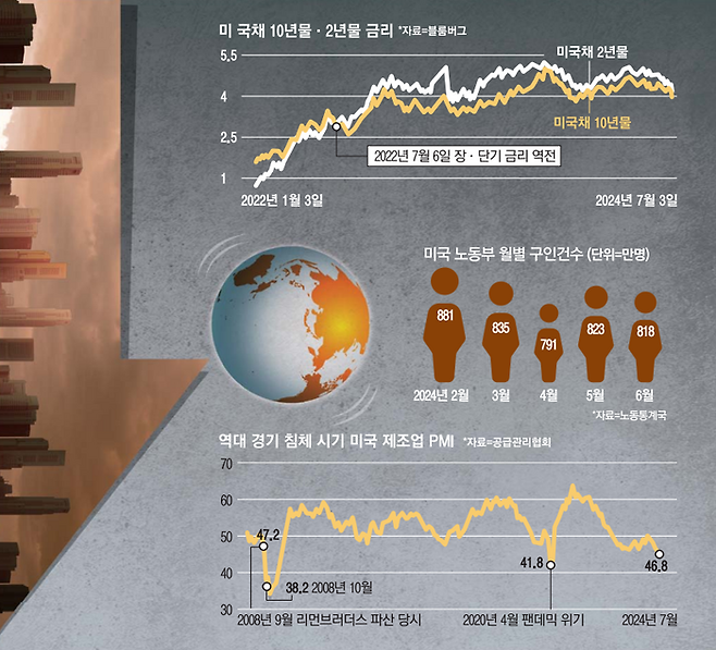 미국 경기침체론은 무엇보다 파월 연준 의장도 우려한 고용시장의 급속한 냉각이 주요 원인으로 꼽힌다. 1일(현지시간) 미국 공급관리협회(ISM)에 따르면 올해 7월 고용지수가 43.4를 기록해 팬데믹 직후인 2020년 6월이후 4년 1개월만에 가장 낮았다.