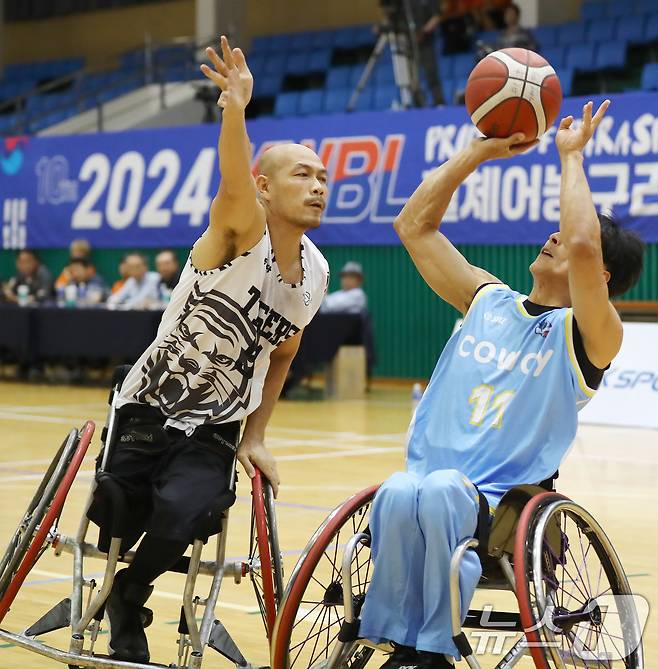 (서울=뉴스1) = 2일 대구시민체육관에서 열린 '2024 KWBL 휠체어농구리그' 춘천 타이거즈와 코웨이 블루휠스 경기에서 춘천 애카싯(왼쪽)이 코웨이 곽준성의 슛을 가로 막고 있다. (한국휠체어농구연맹 제공) 2024.8.2/뉴스1