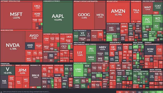 경기침체 우려로 그간 인공지능(AI) 기대감에 급등했던 기술주도 대거 폭락했다. 아마존닷컴은 무려 8.78% 빠졌다. 전날 아마존이 AI에 대규모 자본지출에 나서기로 한 게 더 악재로 작용했다. 아마존은 올해 상반기 동안 AWS 클라우드 유닛을 위한 데이터 센터와 같은 자본 지출에 350억달러를 썼으며, 하반기에는 그 금액이 더 증가할 것이라고 밝혔다. 시장에서는 빅테크들이 AI에 대한 투자를 대거 늘리고 있지만, 충분한 실적이 뒷받침되지 않는 점을 우려하고 있다.