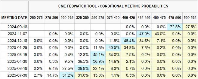 미국 연방기금 선물시장의 기대치를 나타내는 시카고상품거래소(CME) 페드워치의 기준금리 전망도 대폭 낮춰지고 있다. 9월 연준이 50bp 이상 내릴 확률은 72.5%까지 치솟았따. 11월 금리가 현재 보다 100bp 이하로 떨어질 확률도 47.5%에 달한다. 12월 금리가 현재보다 125bp 내릴 확률은 46.4%다.