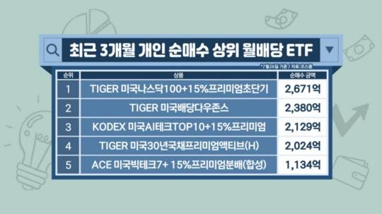 최근 개인투자자들에게 가장 인기를 끈 상품들을 보면 'TIGER미국나스닥100+15%프리미엄초단기'와 'TIGER미국배당다우존스', 'KODEX미국AI테크TOP10+15%프리미엄', 'TIGER미국30년국채프리미엄액티브(H)'로 각 2천억 원이 넘는 순매수세(3개월 기준)가 유입됐습니다. 또 ETF 순자산총액(AUM) 상위권을 살펴보면 'ACE미국30년국채액티브(H)'와 'TIGER미국배당다우존스'가 1조원이 넘는 모습입니다.