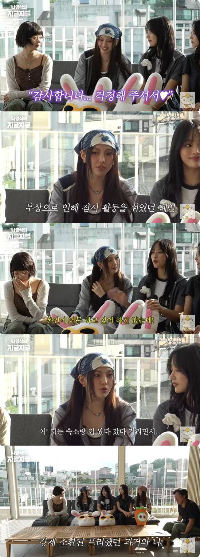 뉴진스를 만난 나영석PD는 "무엇보다 걱정 됐던 건 막내의 부상 소식에 많이 놀랐다"고 밝혔다. 혜인은 발등 부상으로 한 달간 무대에 오르지 못했다. 이에 혜인은 "감사하다. 걱정해주셔서"라고 인사했다.