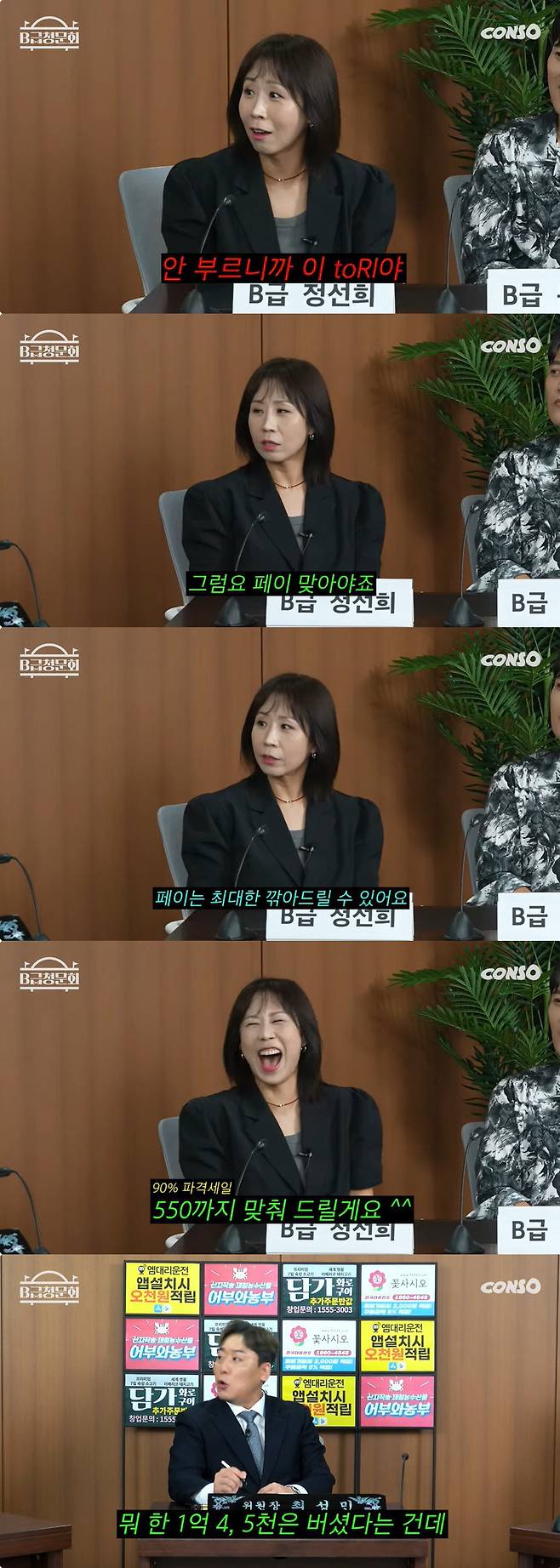 남호연은 "잘나갈 때 회당 5,500만 원을 받았으니까 지금 시세면"이라 말했고 정선희는 "550까지 맞춰드리겠다"고 쿨하게 말했다.