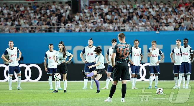 (서울=뉴스1) 박지혜 기자 = 3일 오후 서울 마포구 상암동 서울월드컵경기장에서 열린 쿠팡플레이 시리즈 잉글랜드 프리미어리그 토트넘 홋스퍼와 독일 분데스리가 바이에른 뮌헨의 경기에서 뉴진스가 시축을 하고 있다. 2024.8.3/뉴스1