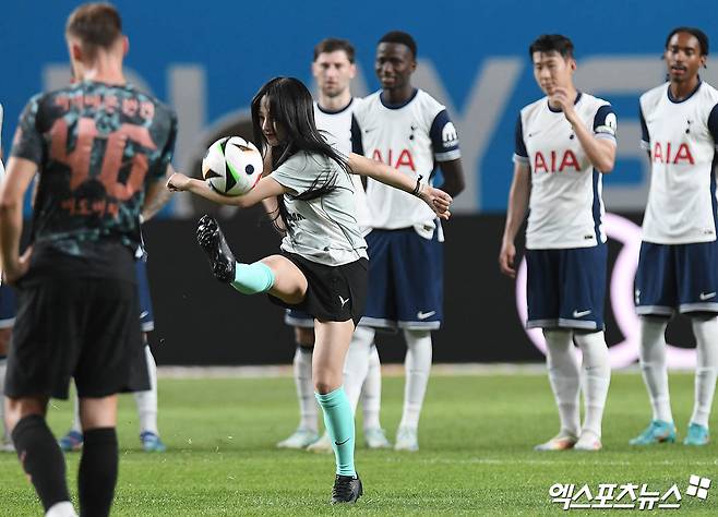 (엑스포츠뉴스 서울월드컵경기장, 박지영 기자) 3일 오후 서울월드컵경기장에서 열린 '2024 쿠팡플레이 시리즈' 토트넘 홋스퍼와 FC 바이에른 뮌헨의 경기에 앞서 그룹 뉴진스 민지가 시축을 하고 있다.