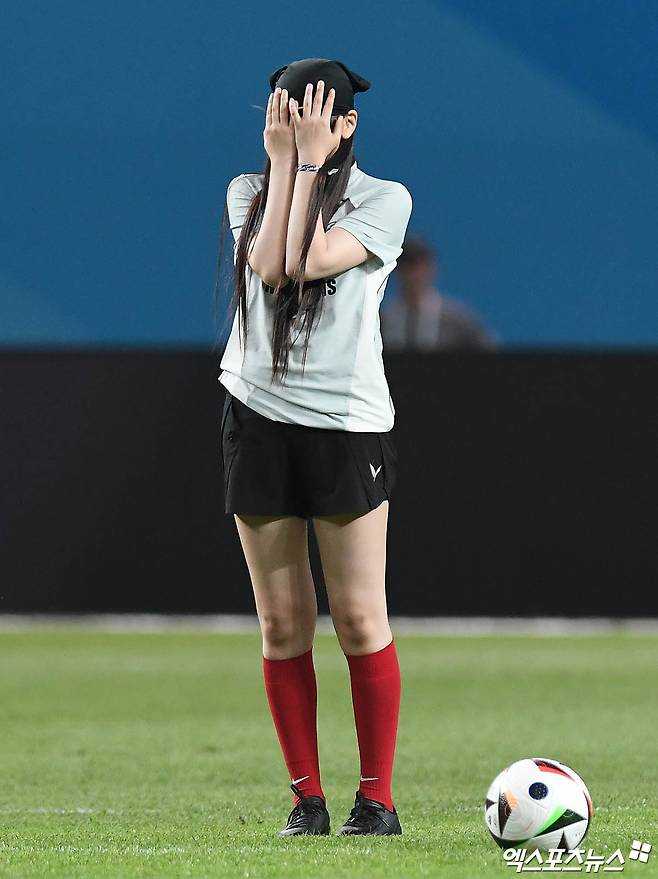 (엑스포츠뉴스 서울월드컵경기장, 박지영 기자) 3일 오후 서울월드컵경기장에서 열린 '2024 쿠팡플레이 시리즈' 토트넘 홋스퍼와 FC 바이에른 뮌헨의 경기에 앞서 그룹 뉴진스 혜인이 시축을 하고 있다.