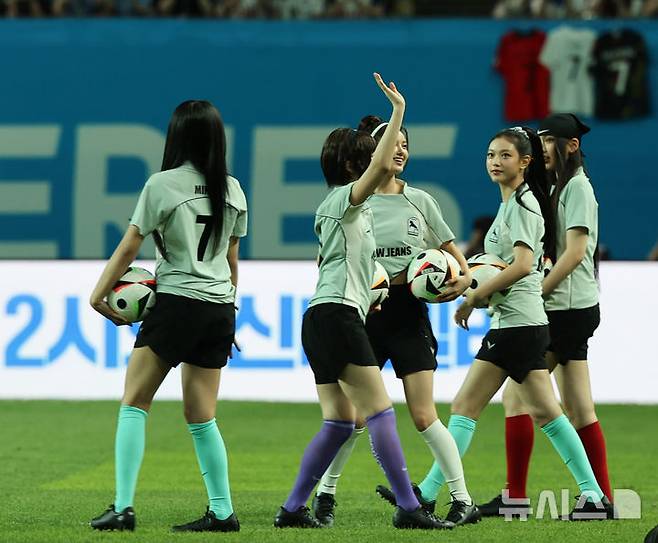 [서울=뉴시스] 김근수 기자 = 걸그룹 뉴진스가 3일 서울 마포구 서울월드컵경기장에서 열린 쿠팡플레이 시리즈 2경기 토트넘 홋스퍼와 FC바이에른 뮌헨의 경기 시작 전 시축을 하기 위해 경기장으로 들어가고 있다. 2024.08.03. ks@newsis.com
