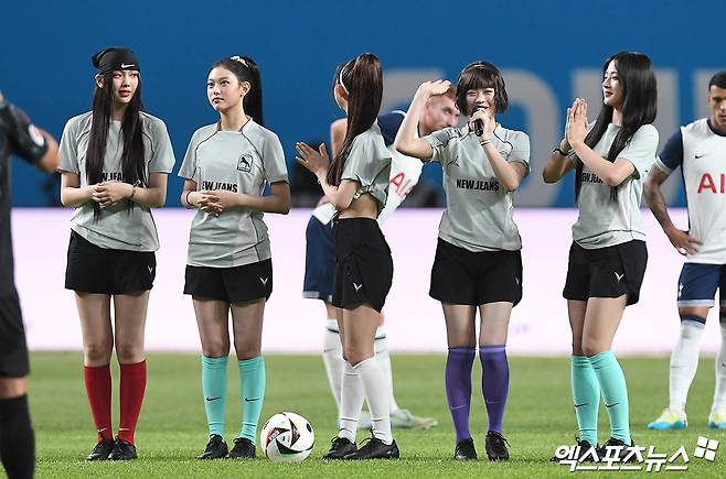 (엑스포츠뉴스 서울월드컵경기장, 박지영 기자) 3일 오후 서울월드컵경기장에서 열린 '2024 쿠팡플레이 시리즈' 토트넘 홋스퍼와 FC 바이에른 뮌헨의 경기에 앞서 그룹 뉴진스가 시축을 위해 그라운드에 나서고 있다.