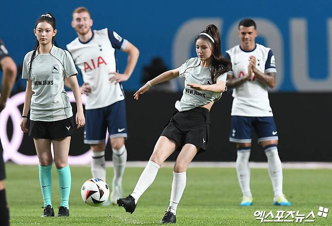 (엑스포츠뉴스 서울월드컵경기장, 박지영 기자) 3일 오후 서울월드컵경기장에서 열린 '2024 쿠팡플레이 시리즈' 토트넘 홋스퍼와 FC 바이에른 뮌헨의 경기에 앞서 그룹 뉴진스 다니엘이 시축을 하고 있다.