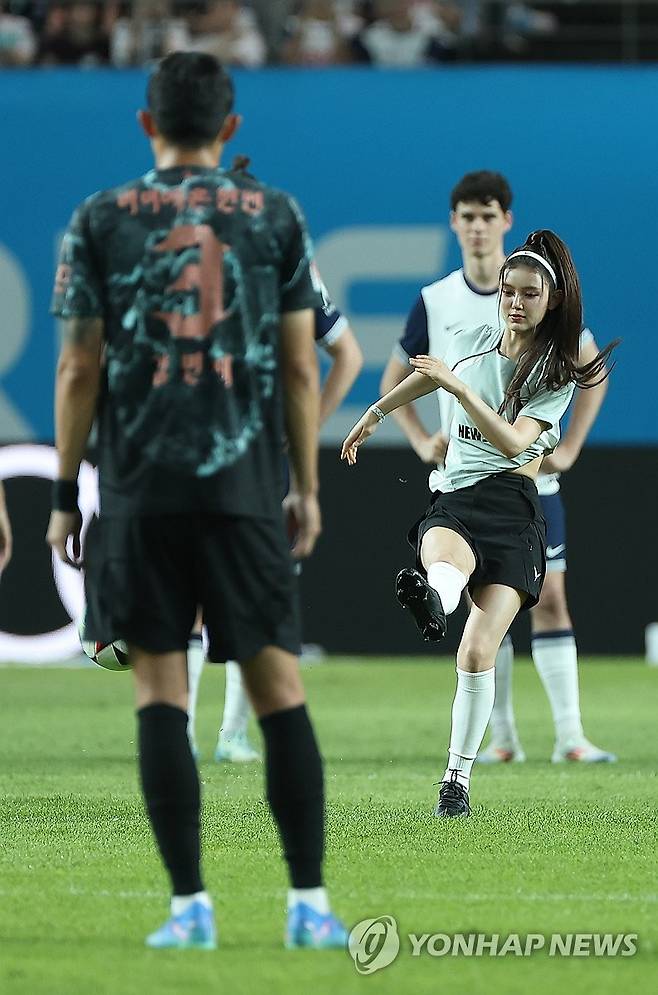 (서울=연합뉴스) 김성민 기자 = 3일 서울월드컵경기장에서 열린 2024 쿠팡플레이 시리즈 2차전 토트넘과 바이에른 뮌헨의 경기. 걸그룹 뉴진스 다니엘이 시축하고 있다. 2024.8.3