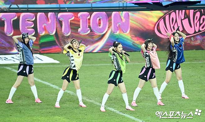 (엑스포츠뉴스 서울월드컵경기장, 김한준 기자) 3일 오후 서울월드컵경기장에서 열린 '2024 쿠팡플레이 시리즈' 토트넘 홋스퍼와 바이에른 뮌헨의 경기, 하프타임때 걸그룹 뉴진스가 멋진 공연을 선보이고 있다.