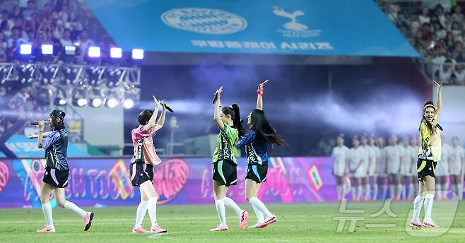 (서울=뉴스1) 박지혜 기자 = 걸그룹 뉴진스가 3일 오후 서울 마포구 상암동 서울월드컵경기장에서 열린 쿠팡플레이 시리즈 잉글랜드 프리미어리그 토트넘 홋스퍼와 독일 분데스리가 바이에른 뮌헨의 경기, 하프타임 때 축하 공연을 하고 있다. 2024.8.3/뉴스1