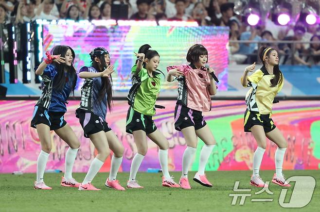 (서울=뉴스1) 박지혜 기자 = 걸그룹 뉴진스가 3일 오후 서울 마포구 상암동 서울월드컵경기장에서 열린 쿠팡플레이 시리즈 잉글랜드 프리미어리그 토트넘 홋스퍼와 독일 분데스리가 바이에른 뮌헨의 경기, 하프타임 때 축하 공연을 하고 있다. 2024.8.3/뉴스1