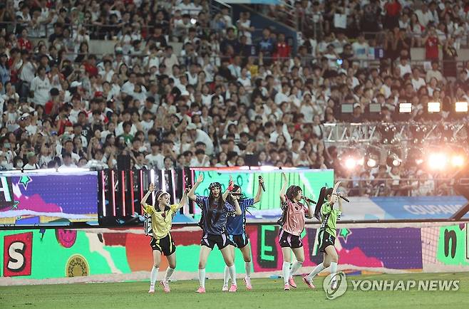 (서울=연합뉴스) 김성민 기자 = 3일 서울월드컵경기장에서 열린 2024 쿠팡플레이 시리즈 2차전 토트넘과 바이에른 뮌헨의 경기. 걸그룹 뉴진스가 하프타임 공연을 진행하고 있다. 2024.8.3
