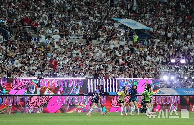 [서울=뉴시스] 김근수 기자 = 걸그룹 뉴진스가 3일 서울 마포구 서울월드컵경기장에서 열린 쿠팡플레이 시리즈 2경기 토트넘 홋스퍼와 FC바이에른 뮌헨의 경기 하프타임 때 축하공연을 하고 있다. 2024.08.03. ks@newsis.com