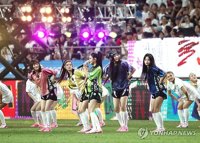 하프타임 때 걸그룹 뉴진스가 공연을 하고 있다. 2024.8.3
