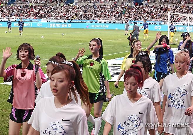 하프타임 때 걸그룹 뉴진스가 공연을 마친 뒤 팬들에게 인사하고 있다. 2024.8.3