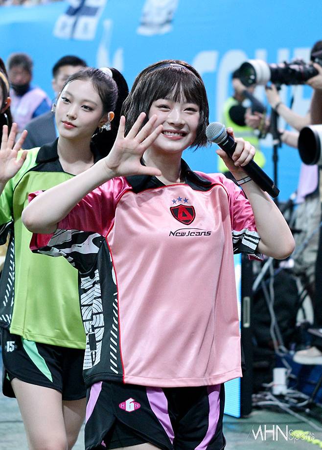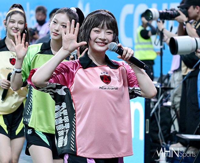 이날 뉴진스 하니가 인사를 하고 있다.