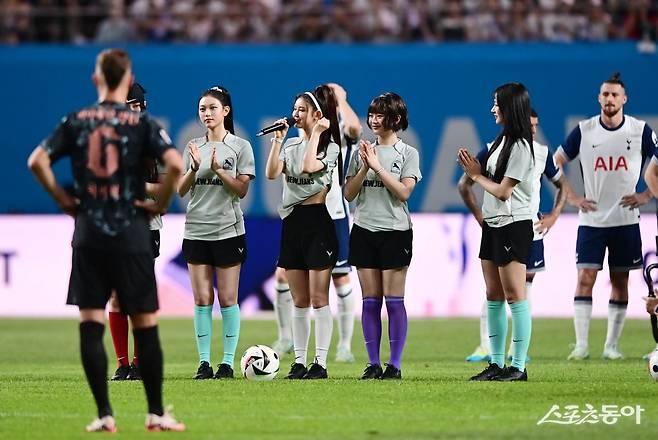 3일 서울월드컵경기장에서 열린 ‘2024 쿠팡플레이 시리즈’ 2차전 토트넘과 뮌헨의 경기에 앞서 그룹 뉴진스가 시축을 하고 있다.