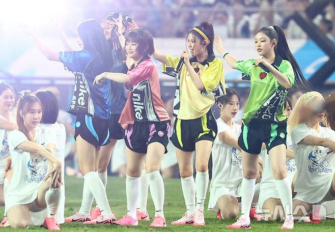 [서울=뉴시스] 황준선 기자 = 3일 오후 서울 마포구 서울월드컵경기장에서 열린 쿠팡플레이 시리즈 2경기 토트넘 홋스퍼와 FC바이에른 뮌헨의 경기, 걸그룹 뉴진스가 하프타임에 축하공연을 하고 있다. 2024.08.03. hwang@newsis.com