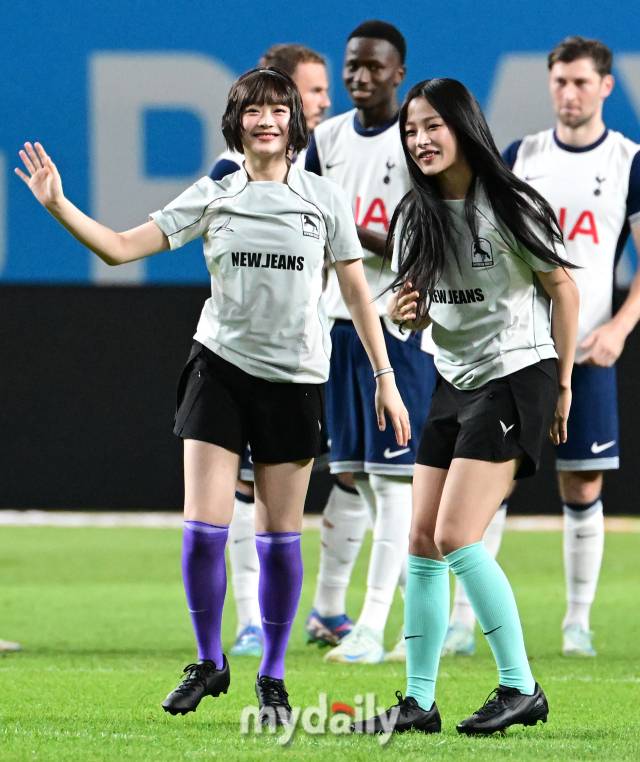 [마이데일리 = 유진형 기자] 3일 서울월드컵경기장에서 '쿠팡플레이시리즈 2경기, FC 바이에른 뮌헨과 토트넘 홋스퍼'의 경기가 열렸다. 경기 전 뉴진스 하니와 민지가 시축을 마친 뒤 행복해하고 있다.