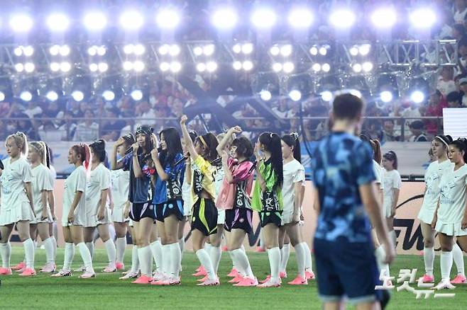 3일 저녁 서울 마포구 서울월드컵경기장에서 열린 2024 쿠팡플레이 시리즈 바이에른 뮌헨과 토트넘 홋스퍼의 경기에서 뉴진스가 하프타임 공연을 진행하고 있다.